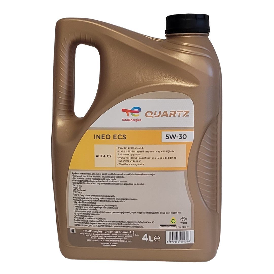 Total Quartz Ineo ECS 5W30 motor yağı, yakıt tasarrufu konusunda ikinci nesil bir yağdır: tüm eski dizel motorlarda kullanılabildiği gibi daha yeni motorlarda da rahatlıkla kullanılır. Benzinli motorlarda kullanılabilir. Total Quartz Ineo ECS 5W30 partikül filtrelerinin çalışması için hayati öneme sahiptir, ayrıca diğer egzos emişyon düşürücü sistemlerle de uyumludur. Vuruntu benzeri bir olay olan ve motora zarar veren LSPI (düşük hız ön ateşleme) problemine karşı motoru korur.